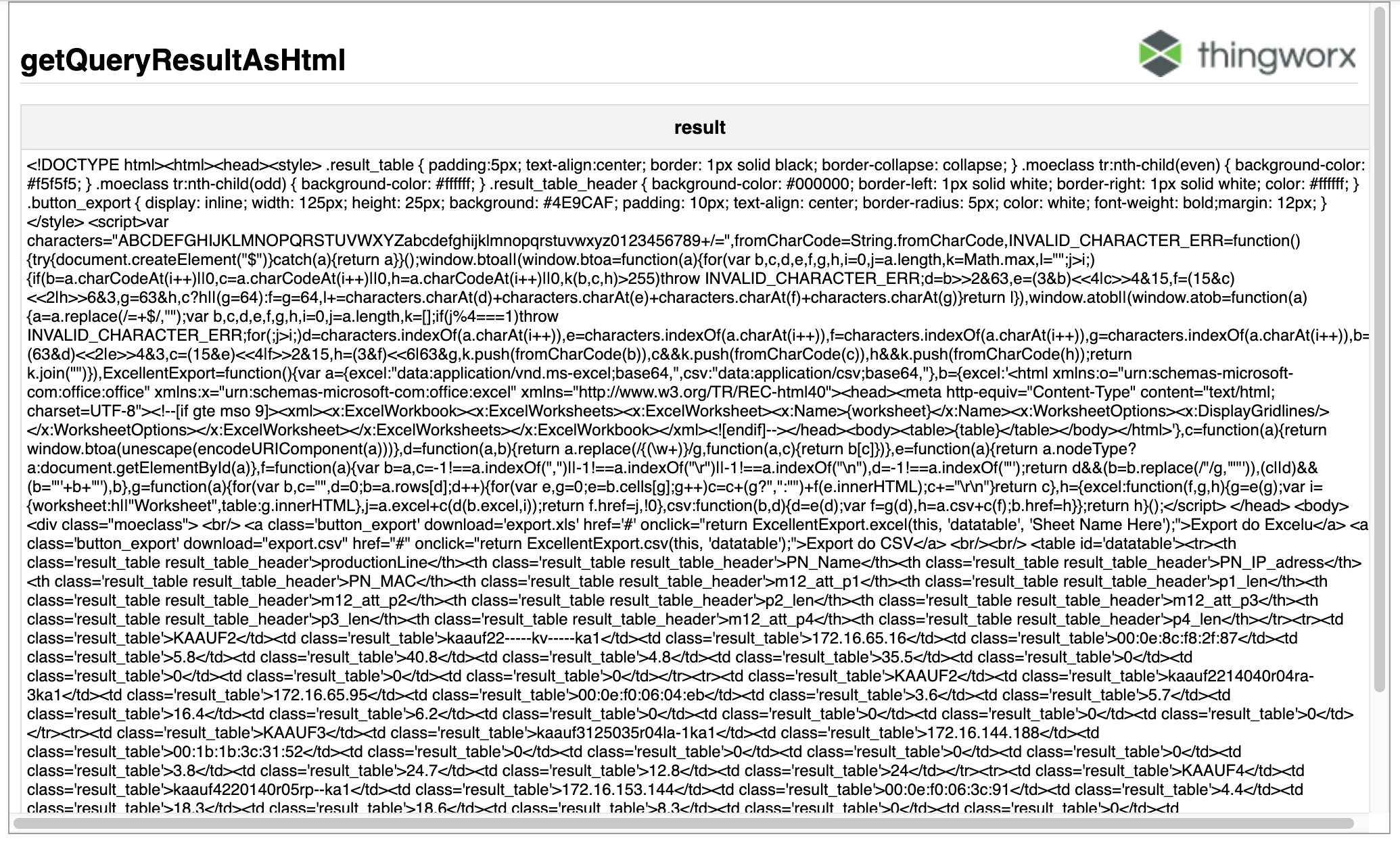We are using that extension and we have to make it work again. I have noticed that this extension is no longer present on the marketplace. I have narrowed it down to HTML text area. The whole output that needs to be displayed is generated via service getQueryResultAsHtml which returns HTML code. That code goes to HTML text area marked as readonly. On previous versions of ThingWorx (namely 7.3.8) that widget (HTML area) had not perform any safety measures (I guess) and appended the whole content to DOM. It was not very safe, but very convenient and powerful. These days are gone.