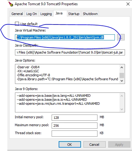 I have set the Tomcat Config/Java/Java virtual Machine path as "C:\Program Files\Java\jre1.8.0_291\bin\server\jvm.dll"