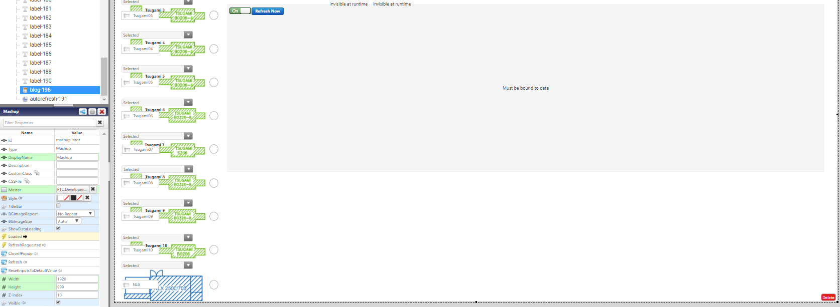 I've ran into what seems a rather strange bug. I included a Blog Widget in a Mashup. After testing out which "view" I liked best (Expanded, List, or Log), the Widget is visually missing from the design space and I cannot select it in the list of Widgets under the Workspace tab. When I say I cannot select it, I mean the widget "blog-196" is highlighted, but it does not highlight anything in the design space and the Properties table just below does not populate the Blog Widget's information. I'd love to delete it and just re-insert another Blog Widget, but you have to be able to select it first. It is a rather annoying bug. I also already restarted my tomcat. All this said, when accessing the Mashup outside of the Composer, the Blog Widget is exactly where I left it. Has anyone run into anything like this before? Am I missing something obvious here? (Unfortunately, I didn't even get the chance to bind it to any services or anything, so I cannot select it in the Connections pane either.) Running ThingWorx 8.1.1-b108