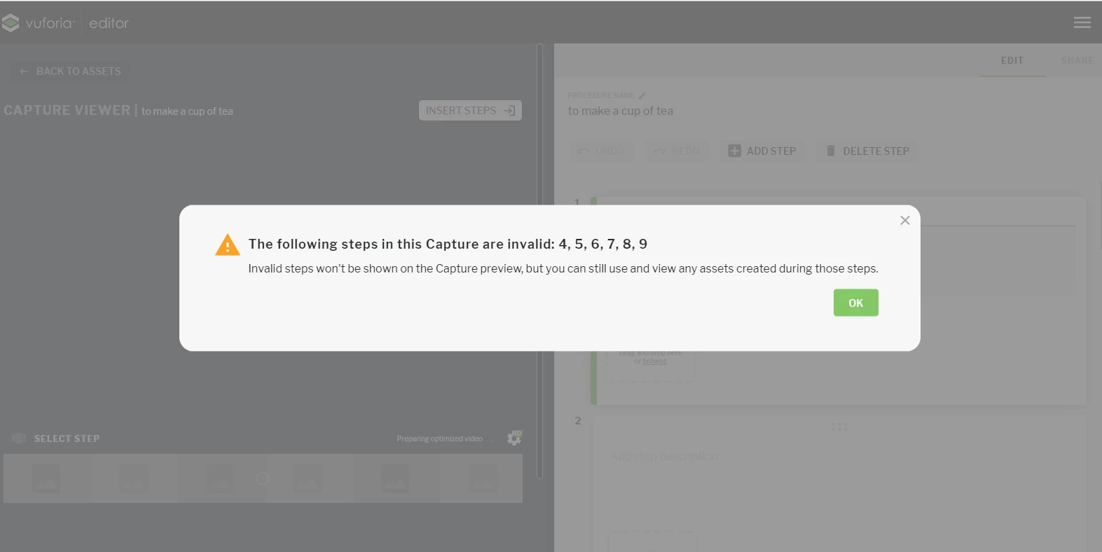 I recorded 9 steps. When I tried to add the new procedure in the Vuforia Editor I got the following error message that I also attached. That some of my steps were invalid and would not be seen.