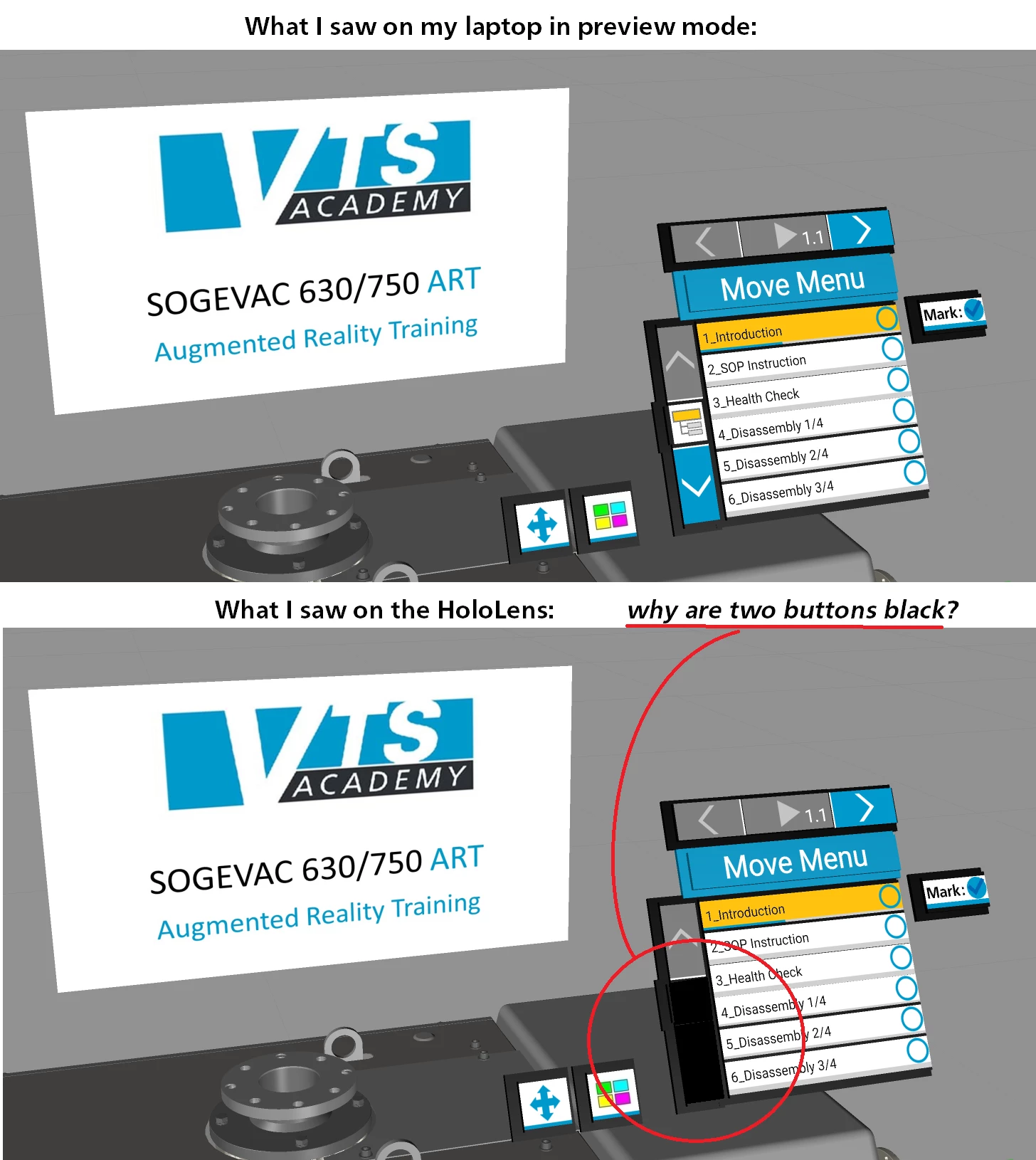 I have two buttons that appear properly in Preview mode on my laptop, but when viewed on the HoloLens they are both black. This isn't due to a missing image resource, since a nearby button is working fine and uses the same image.