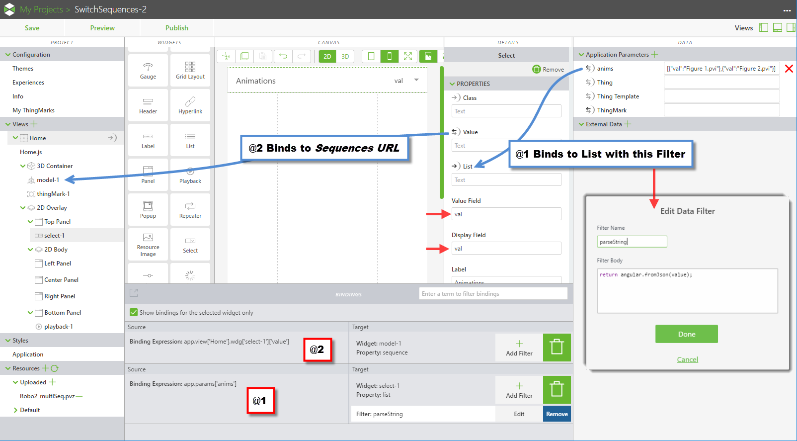 Finally you bind the Value property of the Select widget to the Sequence URL property of the Model widget and that's it.