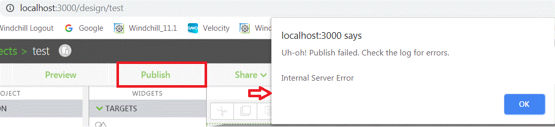 When I click the "Publish" from Vuforia Studio, it pops out error window as "Local host:3000 says, Uh-Oh ! Publish failed.Check for log errors. Internal Serrver error"