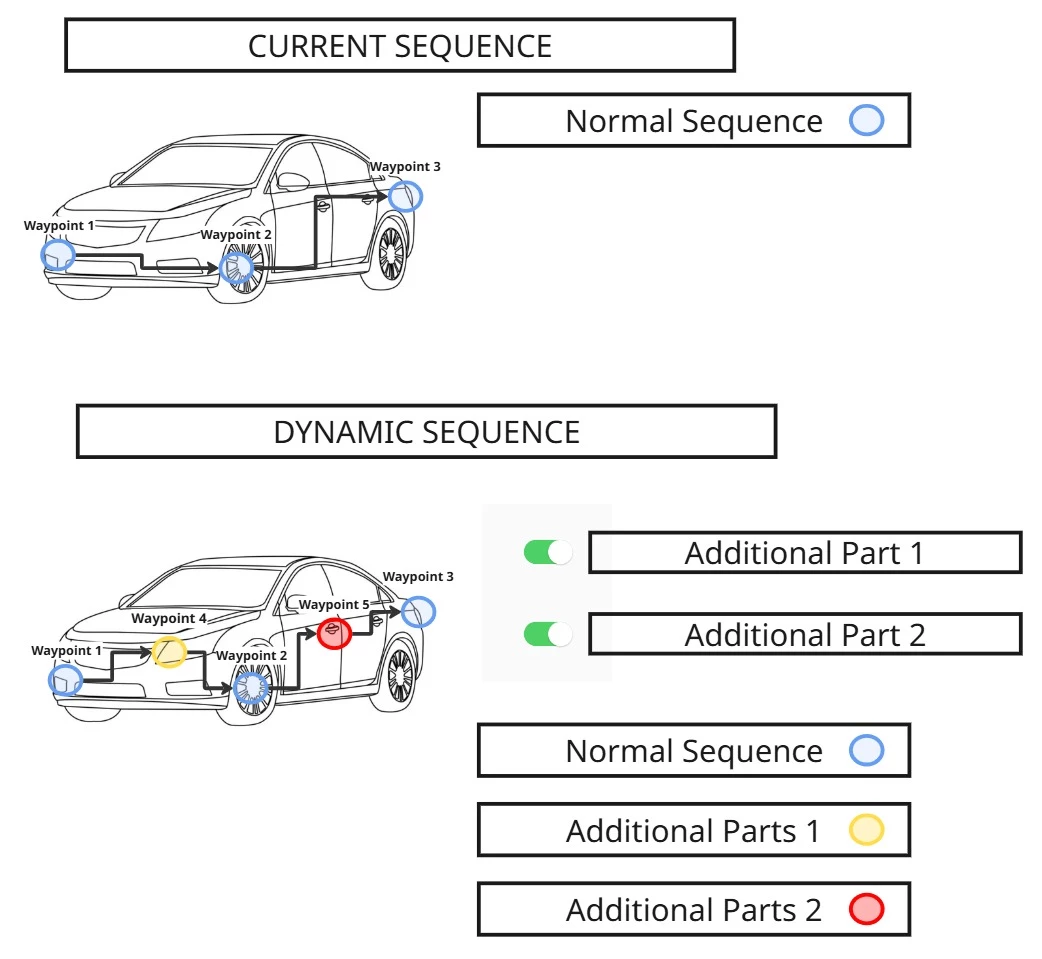 In the post, I attached some images to demonstrate my current conundrum. The first one demonstrates the "Current Sequence" and the "Dynamic Sequence." I would like to create a Dynamic Sequence of the Waypoints in my experience. And in order to visualize this Dynamic Sequence more easily, I created some images to demonstrate the difference between the sequences. And there is another pair of images that shows the interaction of the toggle buttons with the visibility of additional parts, the visibility, and the different sequence of waypoints in the experience.