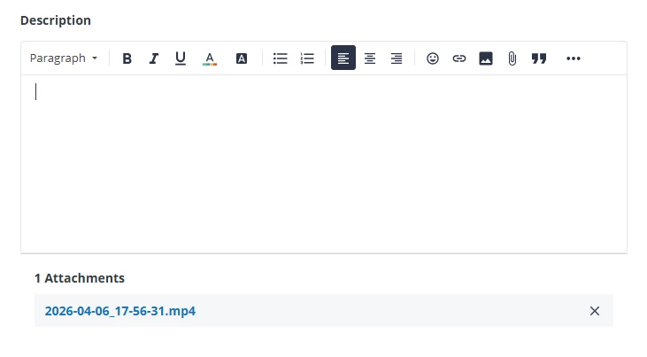 - Videos and other attachments can only be attached using the file attachment button and choose from your files.