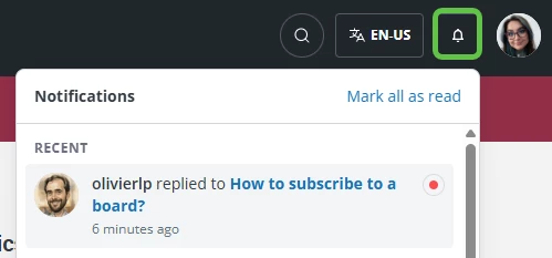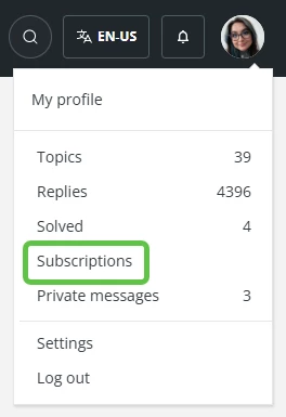 1. You can also view the topics you’re subscribed to by clicking your profile picture at the top, then “Subscriptions” in the drop-down menu.