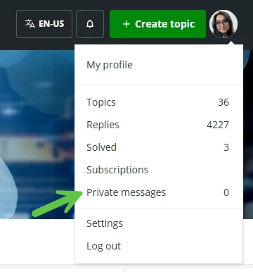 You can access your private messages by clicking on your avatar at the top-right of any community page, and then “Private messages” on the drop-down menu