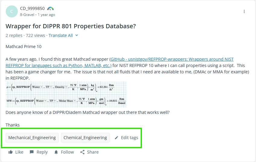 Tags are chosen by the author of a new topic from a predefined list. Each board has a list of tags created by the community team. For example, when you post a question on our Mathcad board, you can select a tag to indicate that the question is about installation. You should chose at least ONE tag. We recommend to apply only one tag, 2 or 3 maximum. Other users can use this tag when filtering posts.