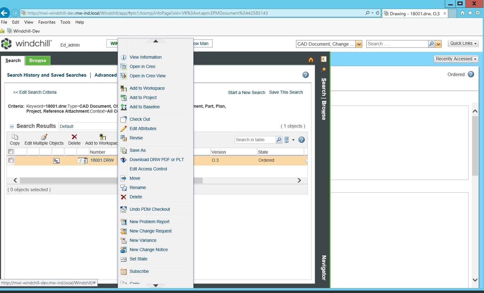 What doesn't work is the ability to download thru a menu button. The two issues I've come across is the custom-actionModels.xml is from Windchill 9, so some of the menu pics are different. The Download DRW PDF or PLT menu pic does appear in the menu, see attached screenshot. When selecting the Download DRW PDF or PLT option, I get an error message as shown below.