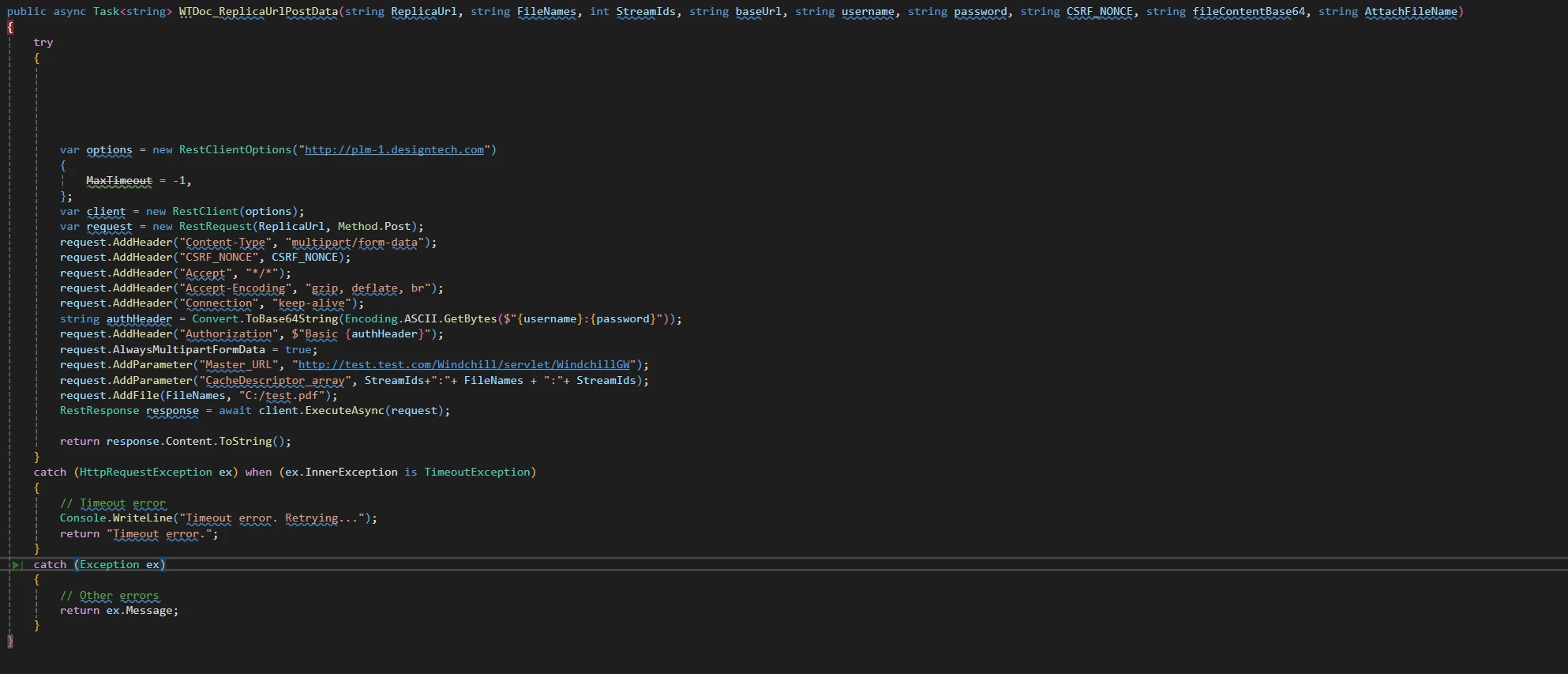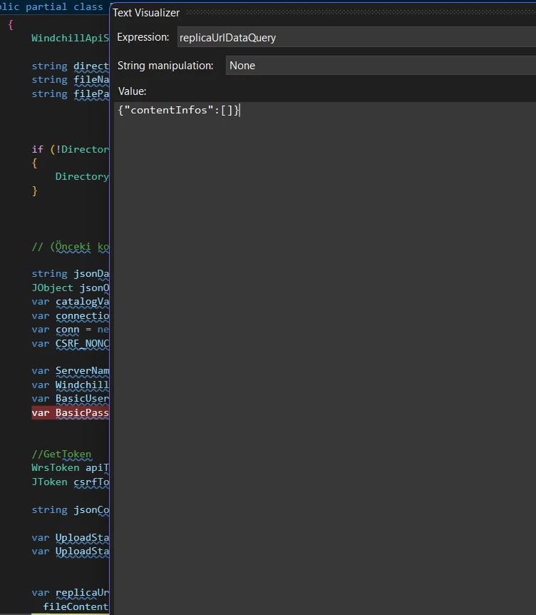 I have set up the code this way with the aim of successfully uploading a document to Windchill using Postman, which works fine. However, when I convert this to C# code, I don't get any errors, but in stage2, the contentInfos is coming up empty. The same data in Postman is coming through filled. I suspect the issue is in the file upload part, but I can't think of a solution. Even though I have downloaded the incoming file to a folder and provided the file path, contentInfos is still empty. Because of this, I am unable to upload the WTDocument through the code. Can you help me with this?