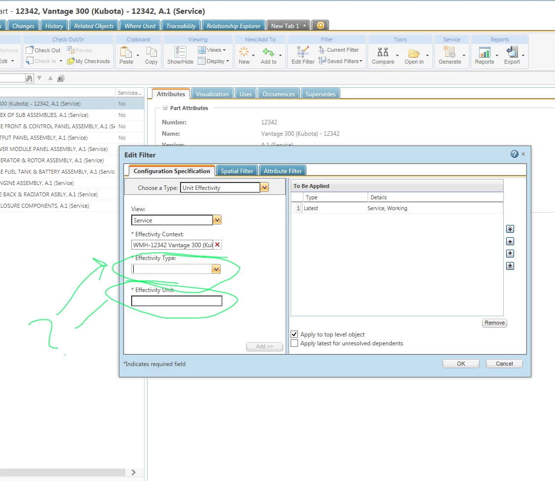 Iām trying to export a filtered BOM to xls for end item using Multi-Level BOM report. To do so I want to use Service Effectivity filter ā but the Effectivity Type pulldown is not populating. Should I not be able to select Serial? Iām after attached ā but filtered by code (wmh-12342).