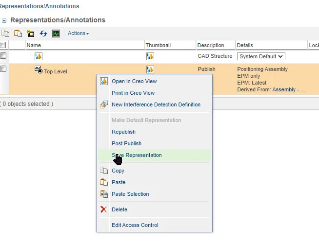 Use Case: When Save Representation (Positioning Assembly) i get an "emty" zip file. Is there a setting/ way to collect the lower reps? = to the same way that Creo View collects?. for now i have to do save as in creoview to get complete pvz