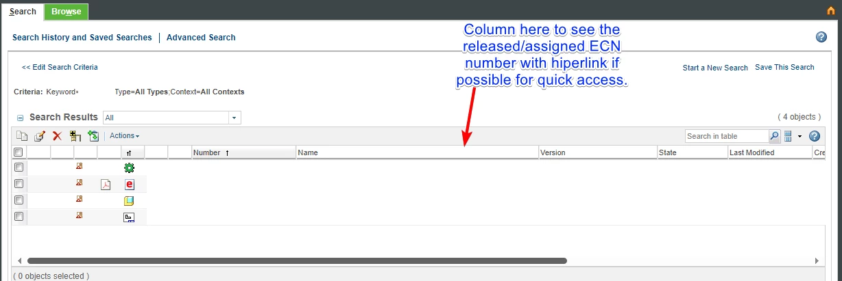 Use Case: I want to add a column with the released/assigned ECN in the search windows results and in the active workspace.