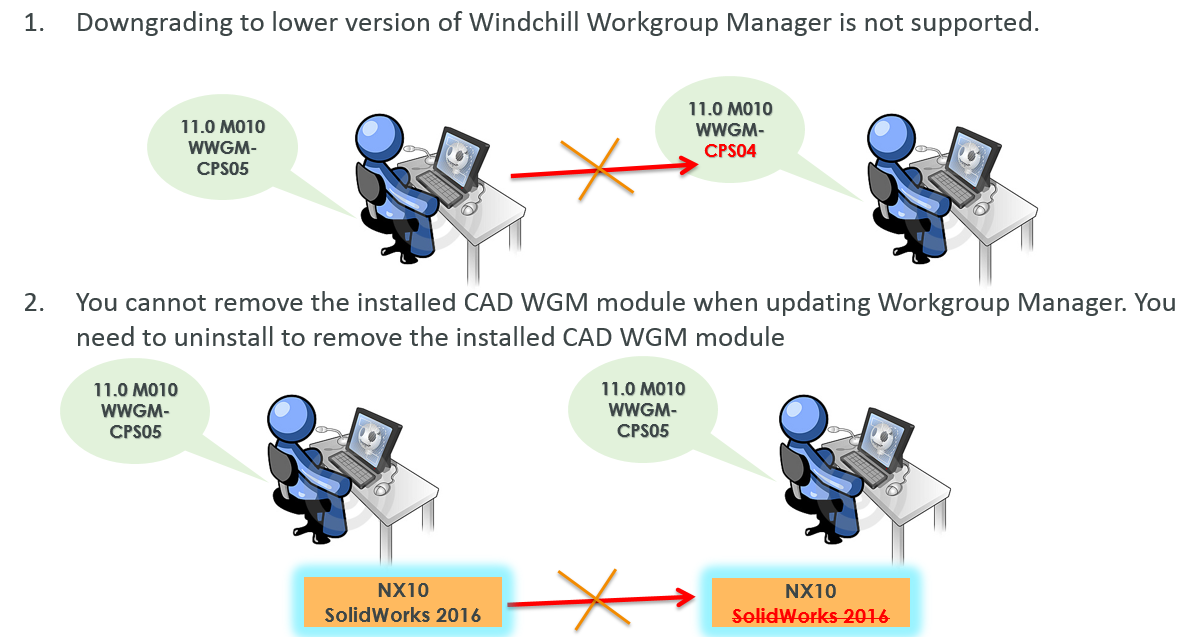 • Example: When Windchill Workgroup Manager 11.0 M010 CPS02 is installed, updating it with Windchill Workgroup Manager 11.0 M010 CPS01 installer is not supported. Uninstallation of the previous Windchill Workgroup Manager version is required.