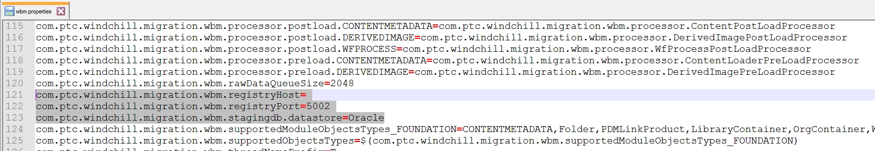 Use Case: I am trying to find the staging server database details from wbm.properties but the values for the entries in the file are empty. where else can i find the details about staging server and username/password details for the wbm set-up?. Below are the entries i did check, com.ptc.windchill.migration.wbm.registryHost= com.ptc.windchill.migration.wbm.registryPort=5002 com.ptc.windchill.migration.wbm.stagingdb.datastore=Oracle also, for staging db credentials, this are my entries, com.ptc.windchill.migration.wbm.load.Staging_DB_PW=encrypted.com.ptc.windchill.migration.wbm.load.Staging_DB_PW com.ptc.windchill.migration.wbm.load.Staging_DB_User=