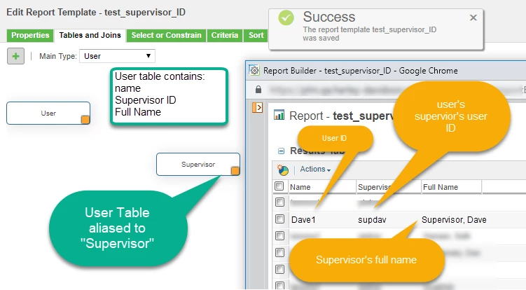 I am trying to configure a query builder report based on the User table. Our user info pulls from LDAP and includes the user ID (name), Full Name, and supervisor. The supervisor value is actually the supervisor's user ID (Name attribute). I'd like be able to have the report show the Full Name of the user's supervisor rather than just the ID. In other words, I'd like to run the report from the Users table and evaluate the returned supervisor ID against the Users table again to have the Full Name returned. Is this possible? I've tried to clarify with an image mockup. I can't find anything that seems to do this... albeit I am fairly new to this. I have started going through the massive reporting document in this community but haven't found anything that helps in this case yet.