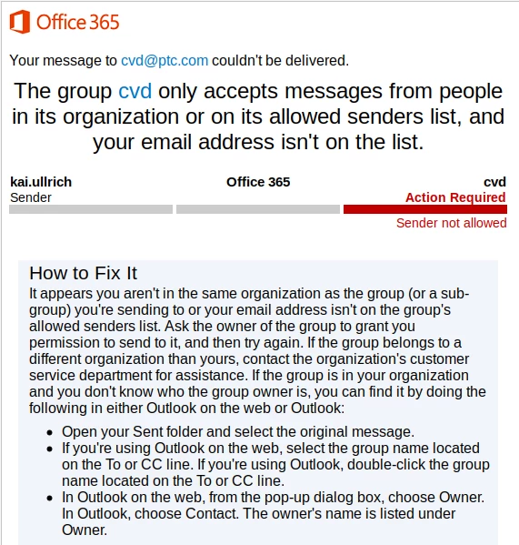 When I try to submit a vulnerability report following the instructions at https://www.ptc.com/en/documents/security/coordinated-vulnerability-disclosure, sending an email to cvd@ptc.com, I'm getting a reply from postmaster@ptc.com saying only senders of the same organization are allowed to use the cvd@ptc.com email address (see attached screenshot). What am I supposed to do to submit my report? Thanks.