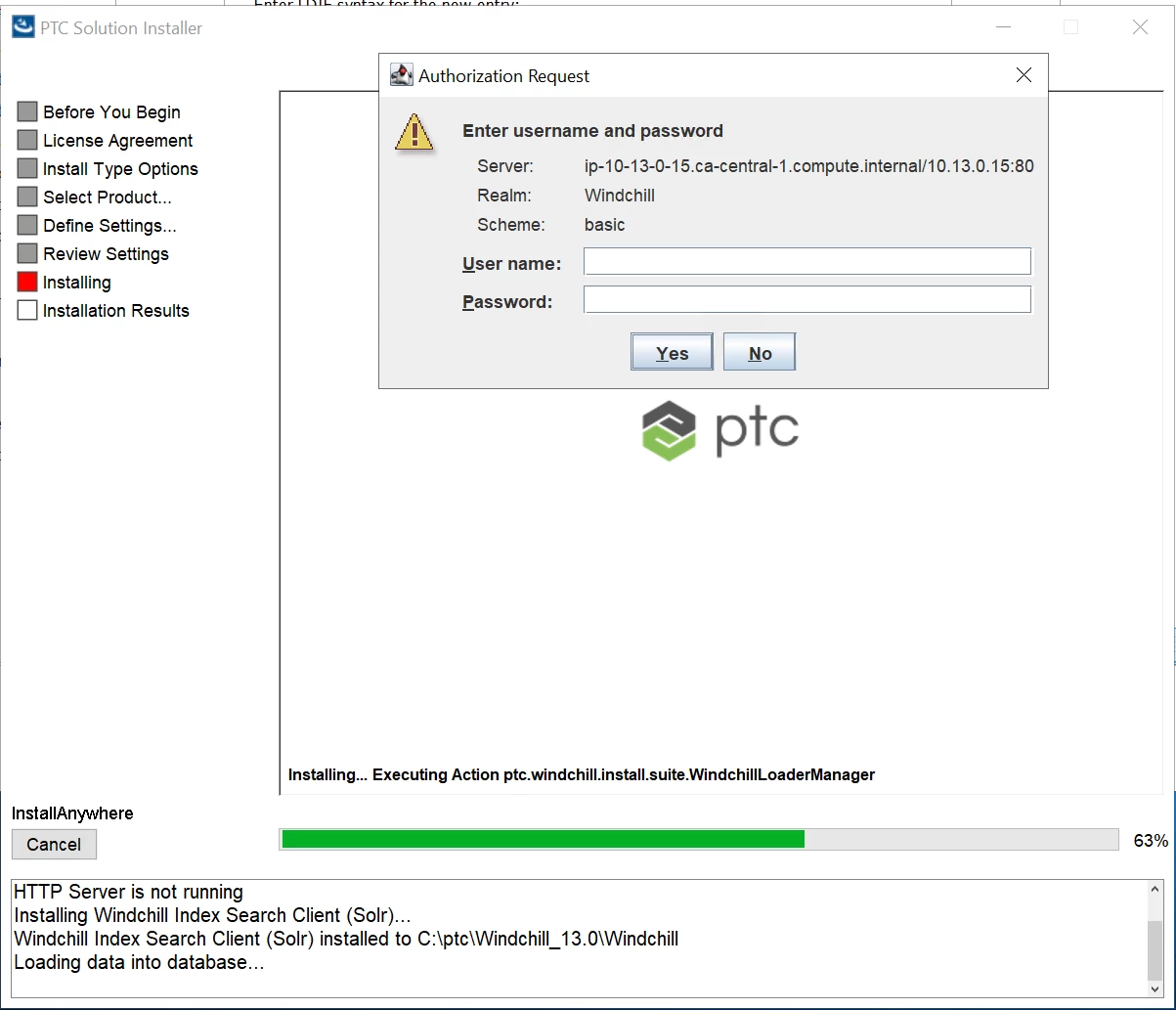 WC 13 PSI installation stuck, a pop up the " Authorization Request" window for user details.