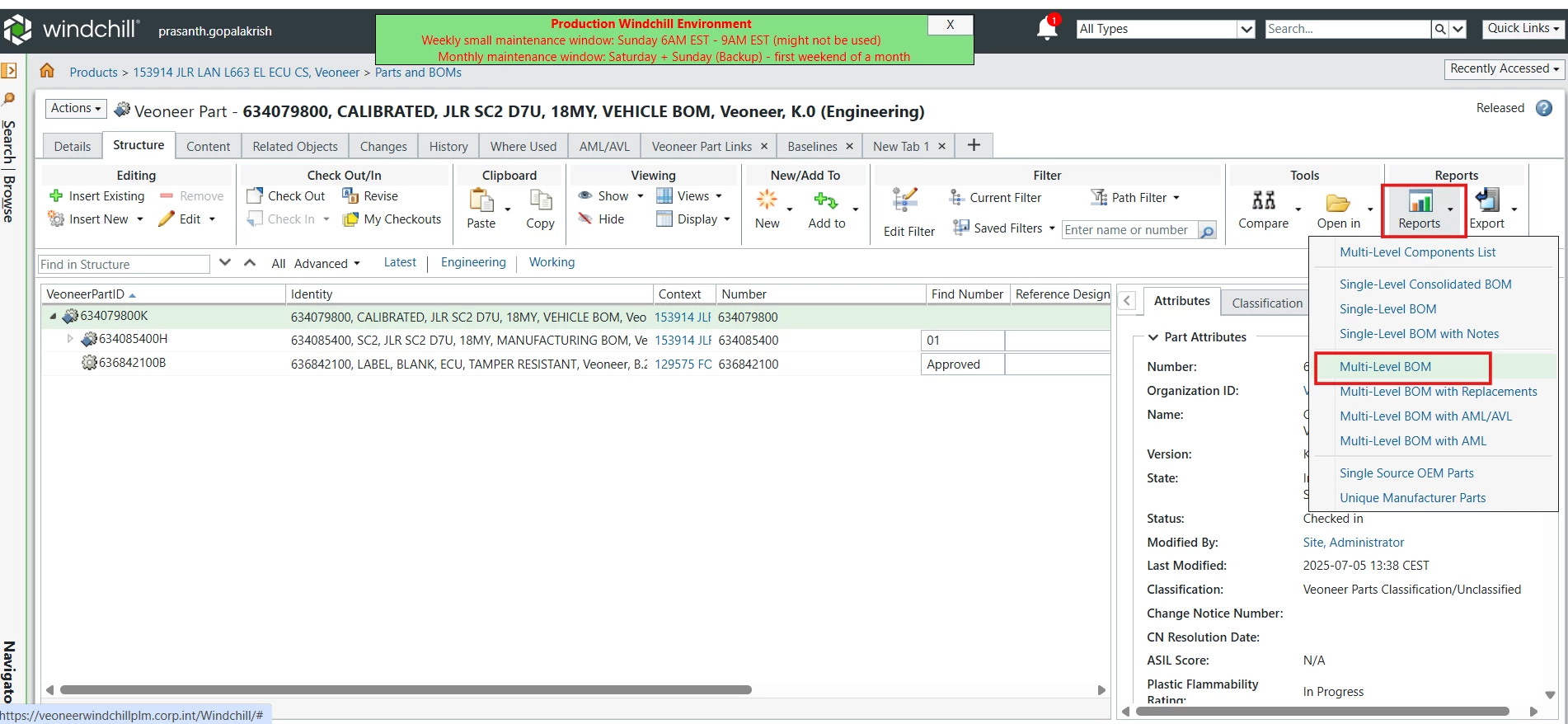 While exporting the Structure BOM by selecting the “Multi Level BOM” option under the Reports tab, the BOM is currently exported with the report name followed by the Username and the current date