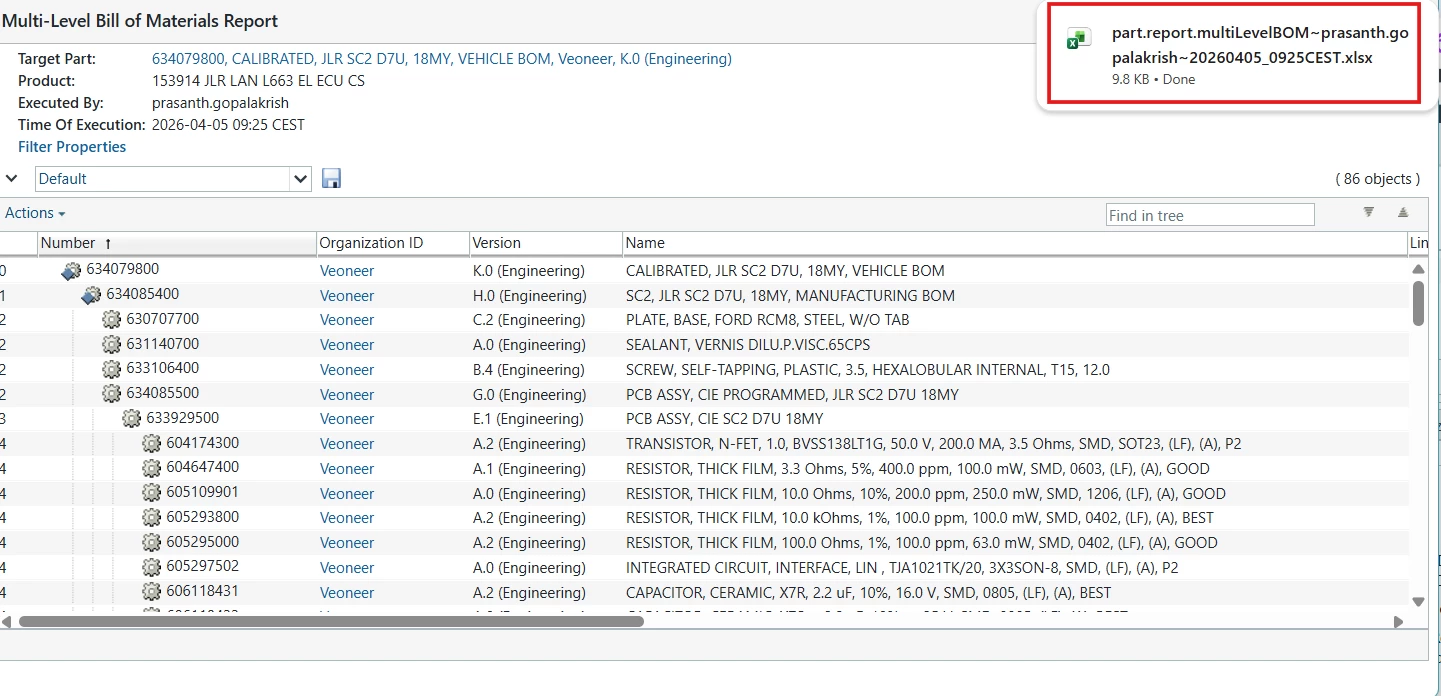 While exporting the Structure BOM by selecting the “Multi Level BOM” option under the Reports tab, the BOM is currently exported with the report name followed by the Username and the current date. We would like to know if there is any possibility to export the file using the Number + Part Name instead.