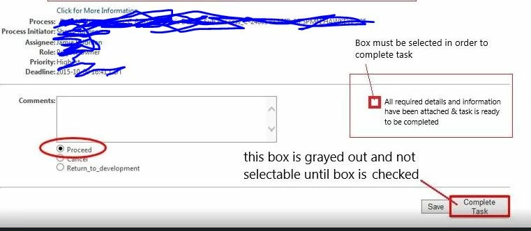 I have to create a check box in the change activity with string type and until the check box is ticked the complete task button should be disabled. please find the attached image for reference.
