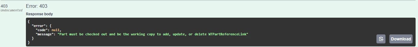 var errorMsg = "Part must be checked out and be the working copy to add, update, or delete WTPartReferenceLink";