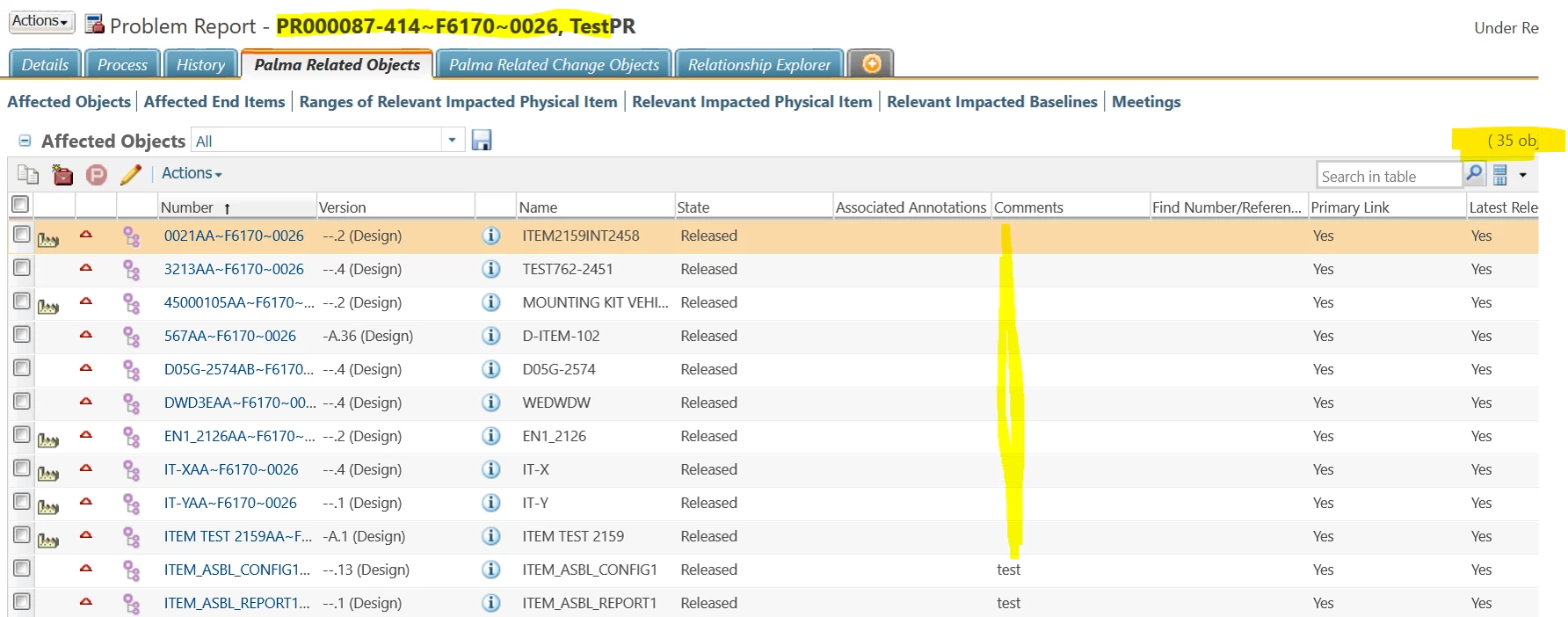 Navigate to Product, select more objects(selected 35 objects), add comment for all and create Problem Report. Once the PR is created, go to related objects tab, and check the list. For some affected objects, the comment is missing in the table. Refer screenshot.