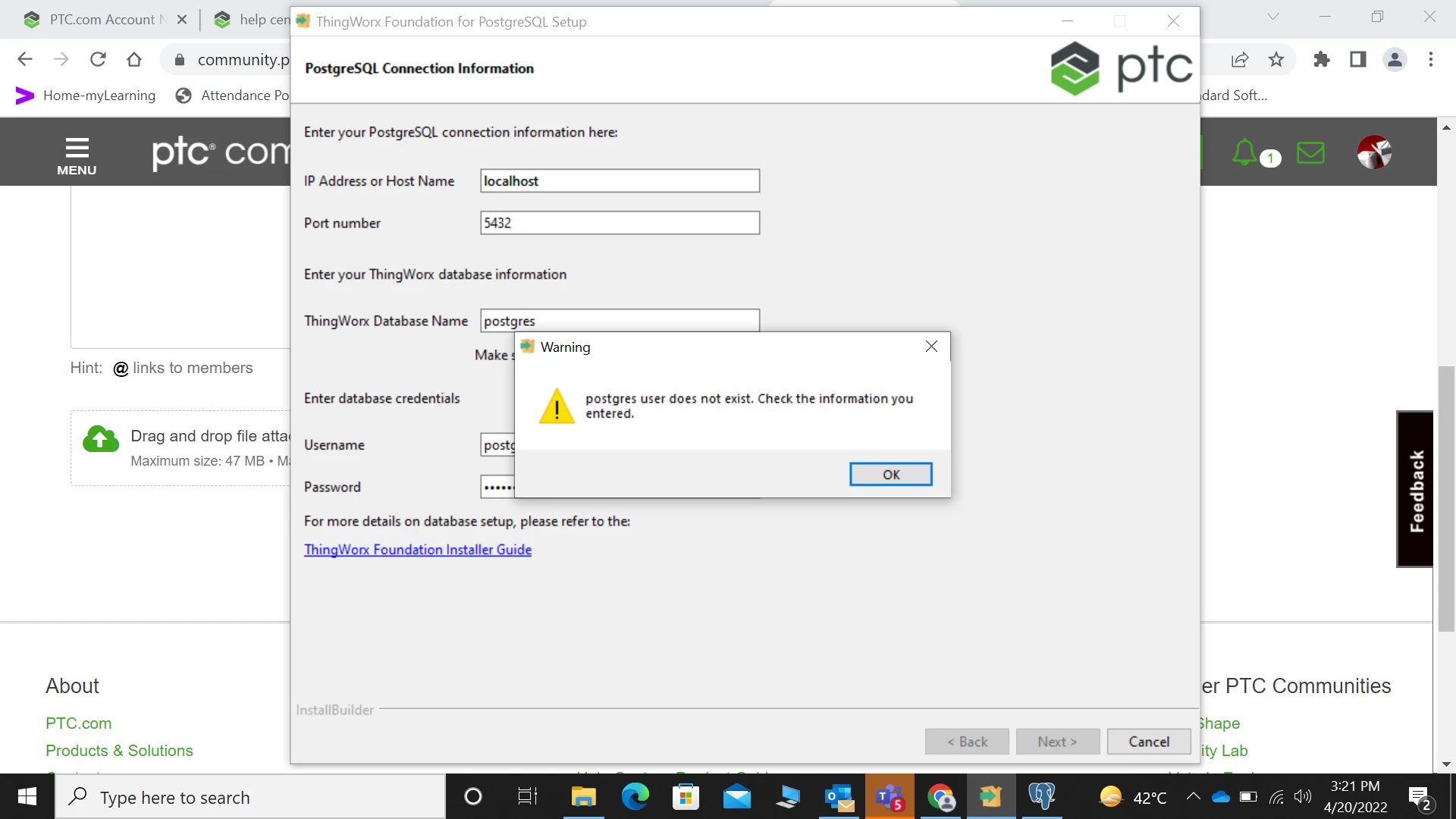 ◦A database user configured as the owner of the ThingWorx database with the following: ▪All privileges granted to this user on the ThingWorx database. ▪The can login property set to yes. This database user will be entered as the ThingWorx database username in the installer.
