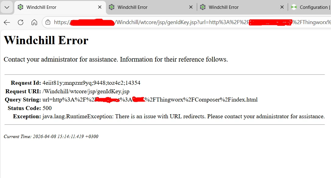 When I am redirected through the Windchill address I connected to, a Status Code: 500 Windchill error screen appears.