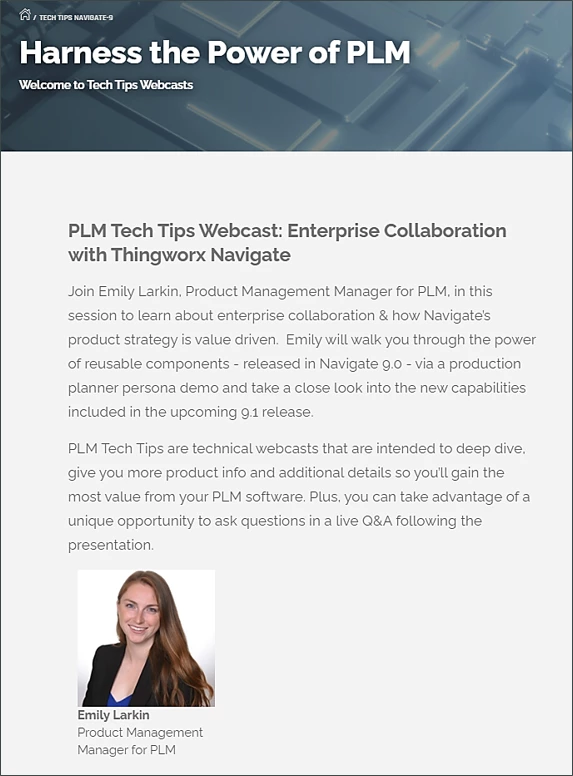 In our next Tech Tips webcast, "Enterprise Collaboration with Thingworx Navigate," we will walk you through the power of reusable components - released in Navigate 9.0 - via a production planner persona demo. We will also deep dive into the new capabilities included in the upcoming 9.1 release.